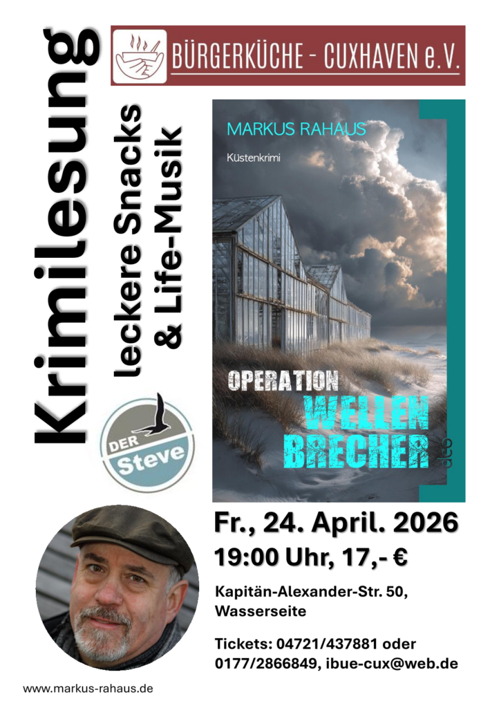 Manche Krimis liest man zur Entspannung – „Operation Wellenbrecher“ hingegen ist ein Adrenalinkick pur. Wenn Markus Rahaus am 24. April 2026 um 19:00 Uhr in der Bürgerküche Cuxhaven, Kapitän-Alexander-Str. 50 (Wasserseite) aus seinem aktuellen Thriller „Operation Wellenbrecher“ liest, erwartet das Publikum ein Abend voller Spannung, Tempo und erschreckender Aktualität.